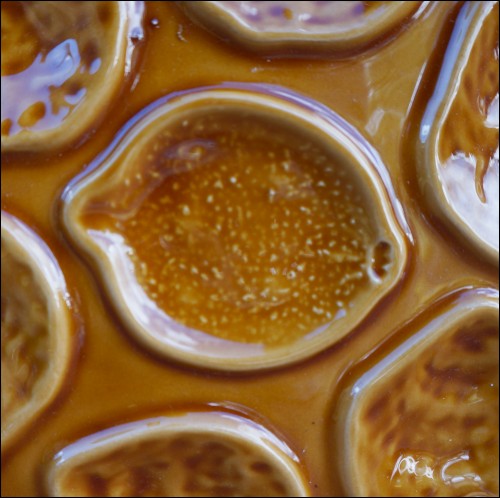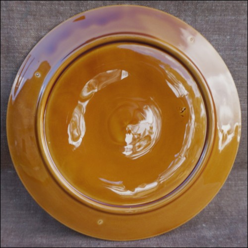Vintage camel brown oyster plate made by the Niderviller studio during the 60's.It's shaped with 6 shell compartments and one for the lemon or the butter. Perfect condition. 9 7/8" diameter. It's signed on the back.