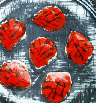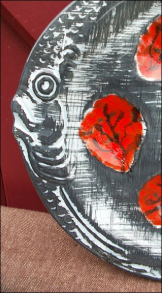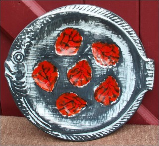 Vintage fish shaped oyster plate with 6 shell wells made by the famous Pornic factory near Quimper during the 70's. It's all hand painted with great enamels. Good condition, two tiny chips on the back as you can see on the pictures below. Signed on the back MFBA Pornic. 10 3/8" diameter.