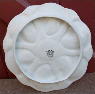 Oyster plate shaped with 6 shell compartments and one central made by PF Limoges around 1970. The pattern depicts 7 different shellfish. It's signed on the back with sculptor mark stamped. 9" 3/4 diameter. Perfect condition.