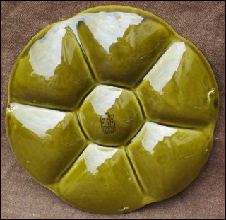 Advertising oyster plate in French majolica made by the famous Gien factory for Trio mark around 1960-1970. Good condition. 9"7/8 diameter.