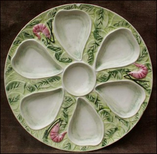 Oyster plate with 6 shell compartments and one central in French majolica made probably by the G.Giroud factory in Moing around 1950. The hand painting pattern in relief depicts shrimps on seaweed. Good condition only a small chip on the edge as you can see on the pictures below.11" diameter.
