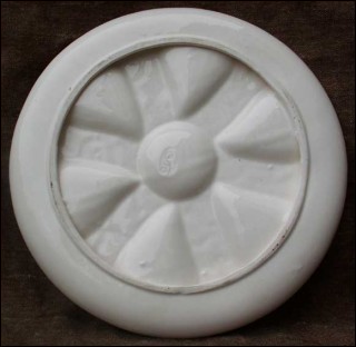 Assiette à huître, peut être la manufacture de monsieur G. Giroud à Moingt avant 1950. Elle est à six compartiments pour les coquillages et un central pour le citron. Elle est au décor de crevettes sur fond de salade. En bon état malgré une grenure. Diamètre 28 cm.
