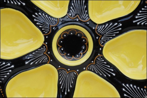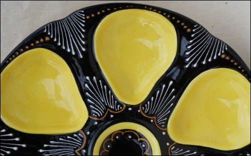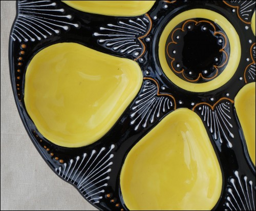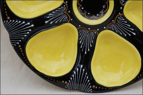 6 yellow shell compartments and one central shaped oyster plate in french majolica made by HB factory in Quimper around 1950.The hand painted pattern shows the delicacy of the embroidery on a black background. 9"1/2 diameter. Perfect condition. It's signed on the back HB Quimper with the drawer and model marks.