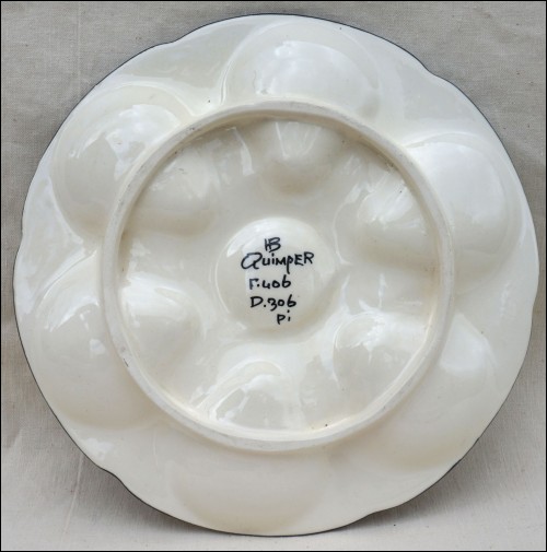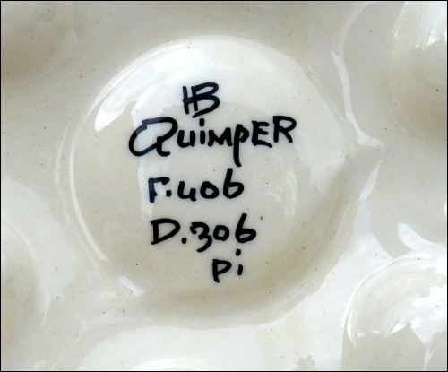 Assiette à huitres de la manufacture HB Quimper, née dans les années 1950. Elle est décorée à la façon des dentelles bretonnes, elle a six compartiments symbolisant les coquillages et un central pour le bol à sauce. Elle est en très bon état, signée sur son fond. Diamètre 24 cm.