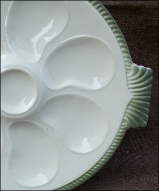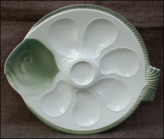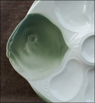 French fish shaped oyster plate with 6 shell compartments and 1 for the lemmon made by the famous Longwy factory during the 1920's. Perfect condition. Stamped Made in France on the back. 10 1/2" by 12 1/4".