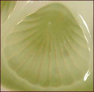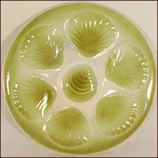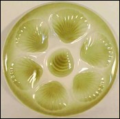 This oyster plate has been made by the famous St Amand les Eaux manufacture during the 40's. Shaped with six scallop compartments for the oyster and one for the lemon the hand painting pattern show great color of green on a beige background. Good condition it's signed Hamage & Moulins des Loups on the back. 9"5/8 diameter.