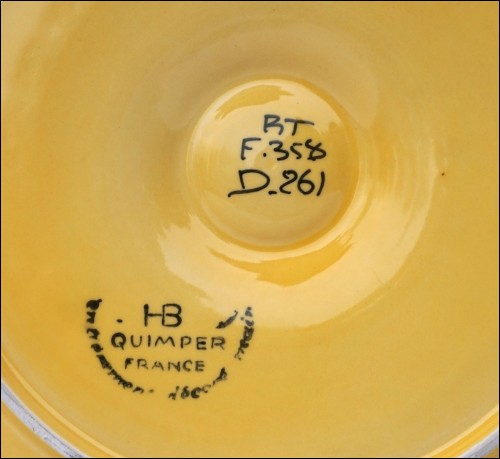 Assiette à huitres à 6 compartiments pour les coquillages et un central de la manufacture HB Quimper vers 1950. Elle est peinte à la main et en bon état. Signé HB Quimper au dos avec marque de décor et de peinteuse. Diamètre 24 cm.