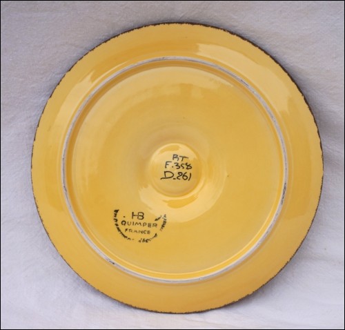 Vintage french hand painted faience oyster plate made by HB Quimper during the 1950's. 9"1/2 diameter (24cm). It's signed on the back. Perfect condition as shown by the following pictures.