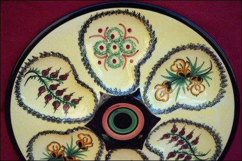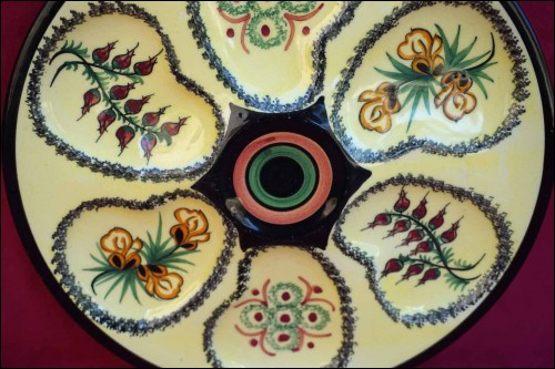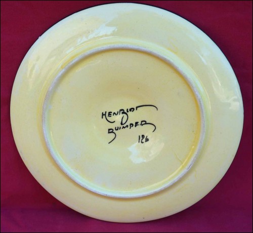 Assiette à huître à six compartiment pour les coquillages et un central pour le bol à sauce de la manufacture Henriot de Quimper, née vers 1950. Elle est peinte à la touche d'un décor floral d'ajonc sur fond jaune pale. Au dos, elle porte la marque de manufacture. Elle est en bon état. Diamètre 22 cm.