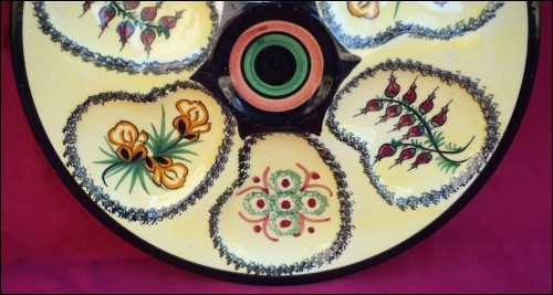 French hand painted faience oyster plate showing flowers and heath made by Henriot Quimper during the 1950's. It's signed on the back with the factory and the drawer marks. 8 3/4" (22cm) diameter. Perfect condition as shown by the following pictures.