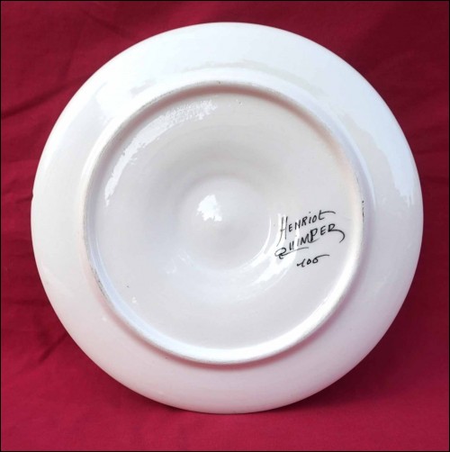 Assiette à huître de la manufacture Henriot de Quimper, née vers 1960. Exécutée par le célèbre peintre décorateur Guy Trévoux. Elle possède six compartiments à huître et un pour le beurre, elle est ornée de motifs des fonds des mers. Elle est en très bon état, et signée sur son fond Henriot Quimper. Diamètre 22,3 cm.