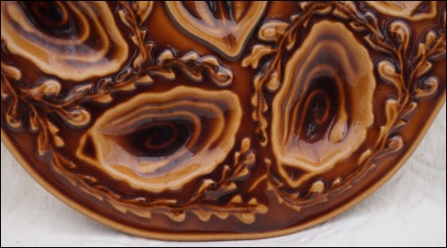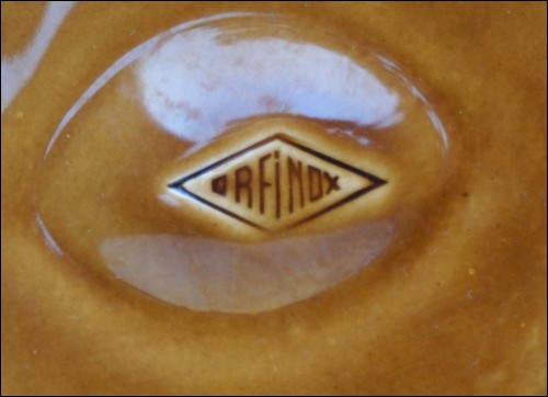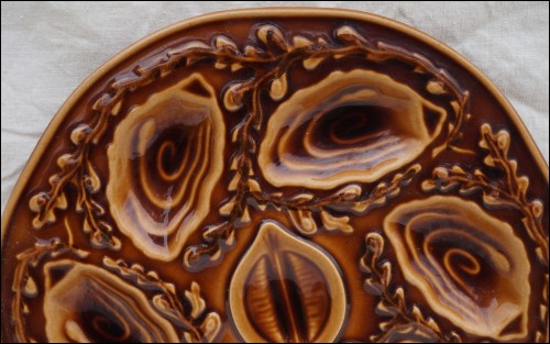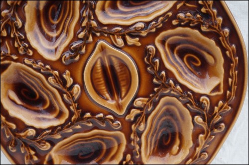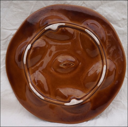 Vintage french majolica oyster plate made by Orfinox during the 60's. It's shaped in 6 oyster compartments and 1 for lemon The relief decor shows seaweed on a cognac background. 9"3/8 diameter. It's signed on the back. Perfect condition as presented on the following pictures.