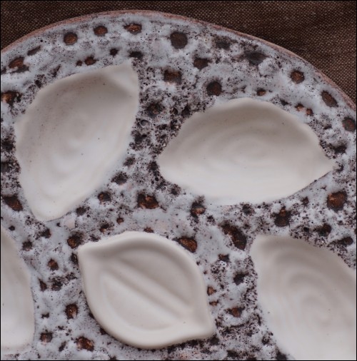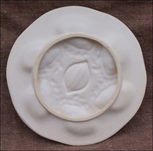 Assiette à huîtres à 6 compartiments en forme d'huîtres et un central en forme de demi citron née, vers 1960 dans la manufacture d'Orfinox. Très bon état. Diamètre 27,5 cm.