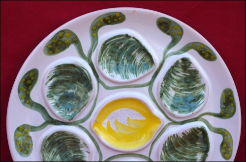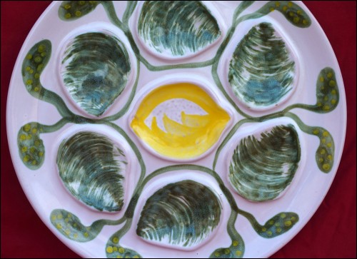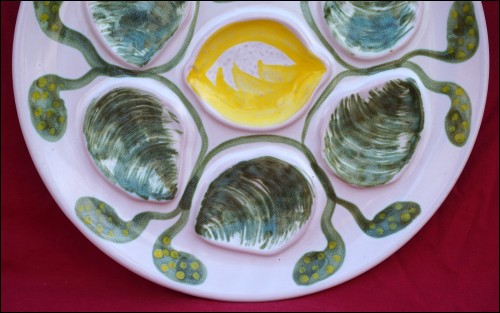 Assiette à huître de la célèbre manufacture de Pornic MBFA, vers 1970. Elle est à six compartiments pour les huîtres et un central pour le citron. Elle est en bon état et signée sur son fond. Diamètre 25.5 cm.