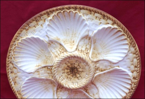 French faience 6 compartments for shells and one central shaped oyster plate made by Longchamp during the 1970's. 9 1/2" (24cm) diameter.Perfect condition as shown by the following pictures.