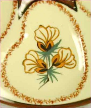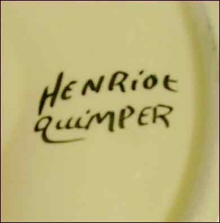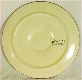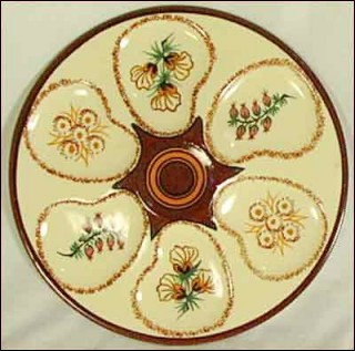 This oyster plate has been made in the famous Henriot Quimper factory around 1950. It's shaped with 6 compartments and one central. The hand painting pattern depicts wild flowers on a light yellow background surrounded by a brown edge. It's signed on the back with the factory marks. 8"3/4 diameter. Good condition.