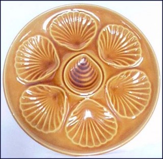 Assiette à huître, en barbotine de St Amand, à sept compartiments, six en forme de coquille St. Jacques, celui du centre pour recevoir le citron. Elle est en bon état malgré deux minuscules grenures. Elle n'est pas signée. Diamètre 25 cm