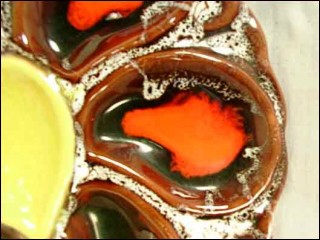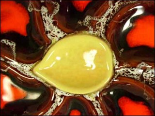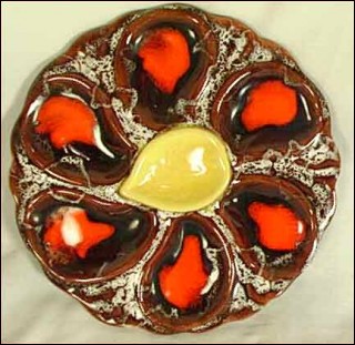 This oyster plate has been made in the famous Vallauris factory around 1950. Shaped with 6 oyster compartments and one central for the lemon it has a great color of the Provence southern of France in the enamel. 8"3/4 diameter.
