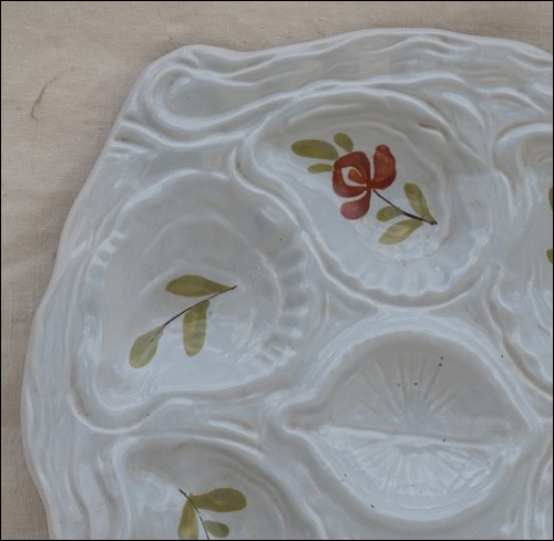 Assiette à huîtres de Desvres par Géo Martel, vers 1960. Elle est à six compartiments pour recevoir les coquillages et peinte à la main. Diamètre 24,6 cm.