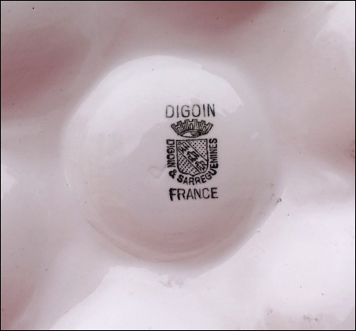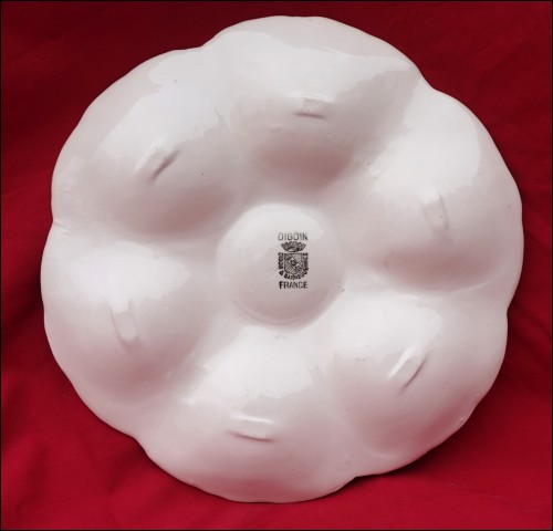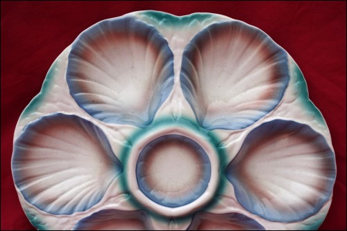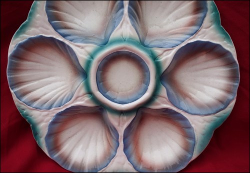 Assiette à huîtres à 6 compartiments pour recevoir les coquillages et un central de l'union de manufactures de Digoin et Sarreguemines, fin XIXe siècle. Très bel état. Signée sur le fond de la manufacture. Diamètre 24 cm.