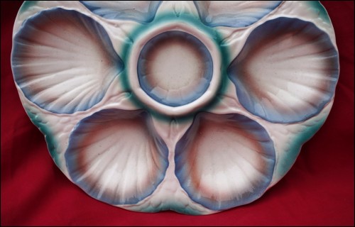 French 6 compartments for shells and one central shaped oyster plate in hand painted faience made by Sarreguemines late 19th century.It is stamped on the back Digoin Sarreguemines France. 9 1/2" diameter.Perfect condition as shown by the following pictures.