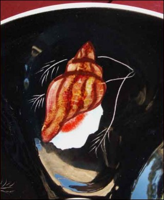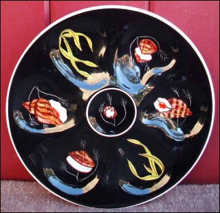 Rare 6 shell compartments and one central shaped oyster plate in french majolica made by the famous Guy Trevoux artit in the Henriot Quimper factory during the 1950's. The hand painted decor depicts shell and sea life on a black background. Perfect condition. 8"3/4 diameter. It's signed Henriot Quimper on the back.