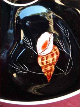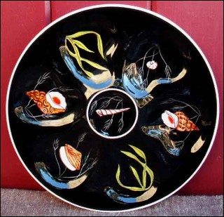 Rare 6 shell compartments and one central shaped oyster plate in french majolica made by the famous Guy Trevoux artit in the Henriot Quimper factory during the 1950's. The hand painted decor depicts shell and sea life on a black background. Perfect condition. 8"3/4 diameter. It's signed Henriot Quimper on the back.