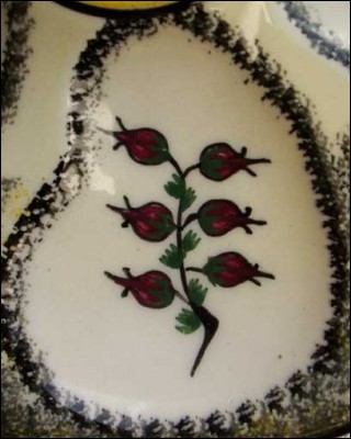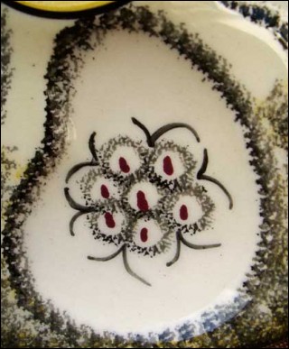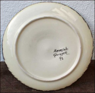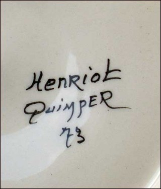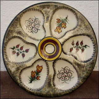 This oyster plate has been made in the famous Henriot Quimper factory around 1950. It's shaped with 6 shell compartments and one central. The hand painting pattern depicts wild flowers on a brown grey background surrounded by red edge. It's signed on the back with the factory and the drawer marks. Perfect condition.8"3/4 diameter.