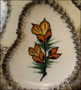 Assiette à huîtres de la manufacture Henriot de Quimper, née vers 1950. Elle est à 6 compartiments pour les coquillages et peint à la touche d'un décor floral d'ajoncs sur fond gris brun. Au dos, elle porte la marque de manufacture. Elle est en bon état. Diamètre 22 cm.