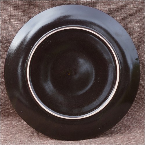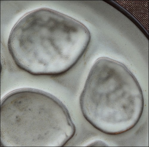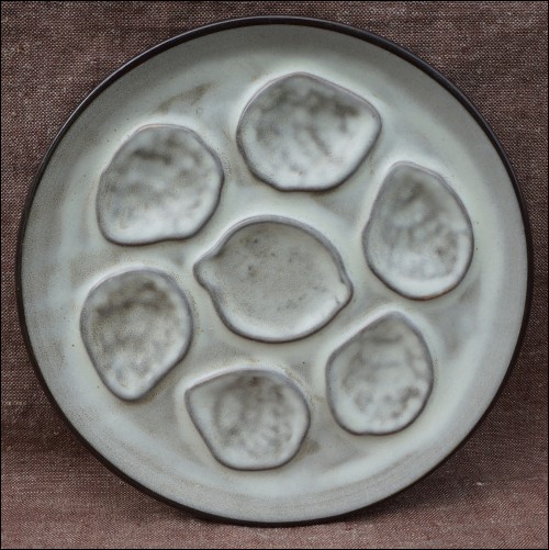 Assiette à huîtres en grès de la manufacture de céramique lorraine de Niderviller, née vers 1970. Elle est à six compartiments destinés à recevoir les huîtres, et un central pour le citron. Elle est en bon état, non signée sur son fond. Elle est en bon état. Diamètre 25,5 cm.