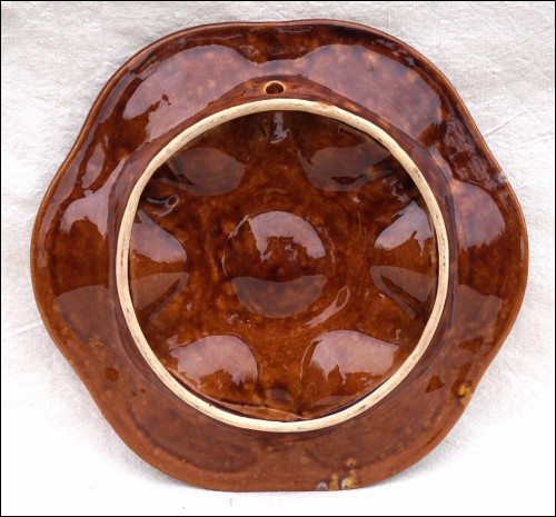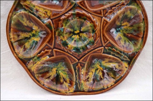 French hand painted oyster plate made by Saint-Jean-de-Bretagne near Quimper during the 1960's. It's shapped with 6 shell compartments and one for the lemon or the butter. It has great colors of enamel on a brown background. 10 1/4" (26cm) diameter. Good condition a tiny glaze shortage in front as shown by the following pictures.