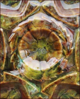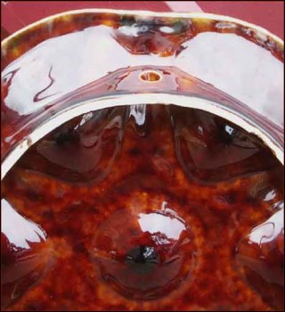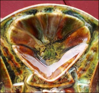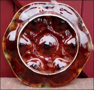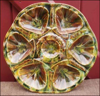 Oyster plate in french majolica made by the famous Saint-Jean-de-Bretagne factory near Quimper during the 1960's. It's shapped with 6 shell compartments and one for the lemon or the butter. It has great colors of enamel on a brown background. 10"1/4 diameter. Good condition only a tiny glaze shortage on the edge of the well as you can see on the pictures below.
