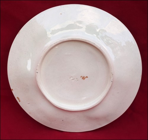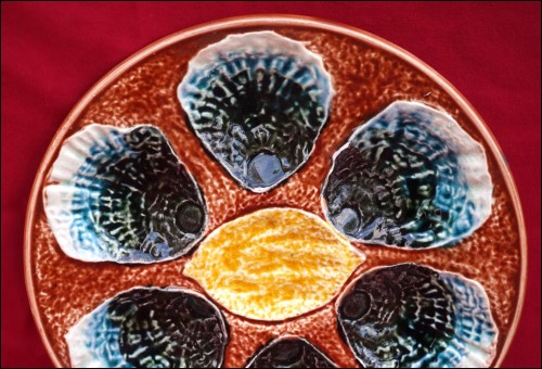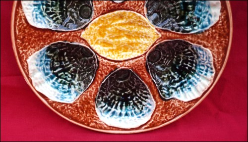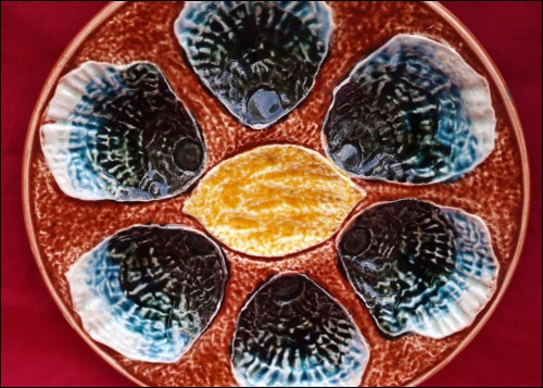 Rare assiette à huîtres sûrement de la manufacture de Salins, vers 1900. Elle est à sept compartiments, six pour les coquillages et un central pour le citron. Elle est en très bel état, et porte des marques de manufacture sur son dos. Diamètre 22cm.