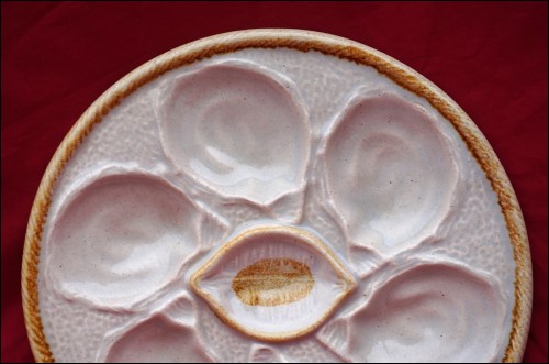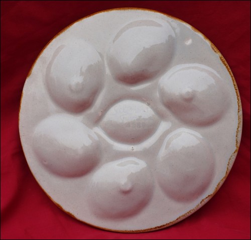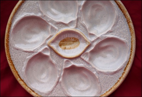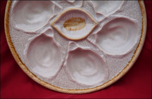 Vintage french faience oyster plate with pancake decor made by Saint-Clement during the 1960's. 9 7/8" (25cm) diameter. It's signed on the back with the manufacture's mark. Perfect condition as shown by the following pictures.