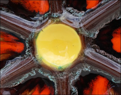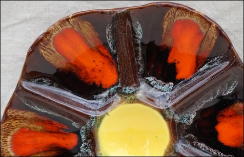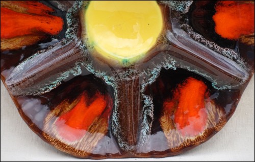 Assiette à huître à six compartiments pour les coquillages et un central pour le citron, Vallauris vers 1970. La majolique est à décor remaillé. Elle n'est pas signée Vallauris. Elle est en bon état. Diamètre 24 cm.
