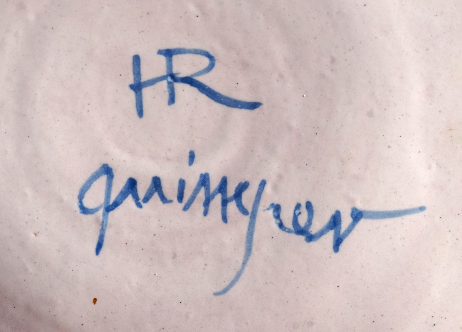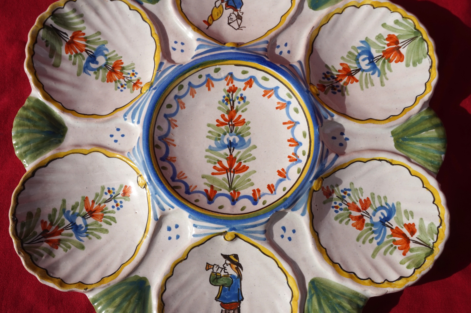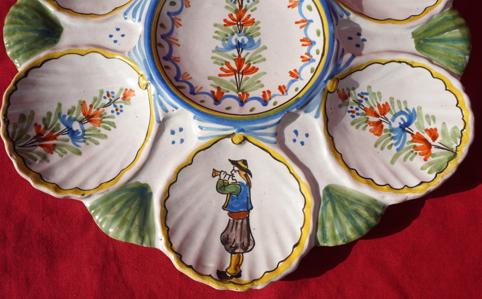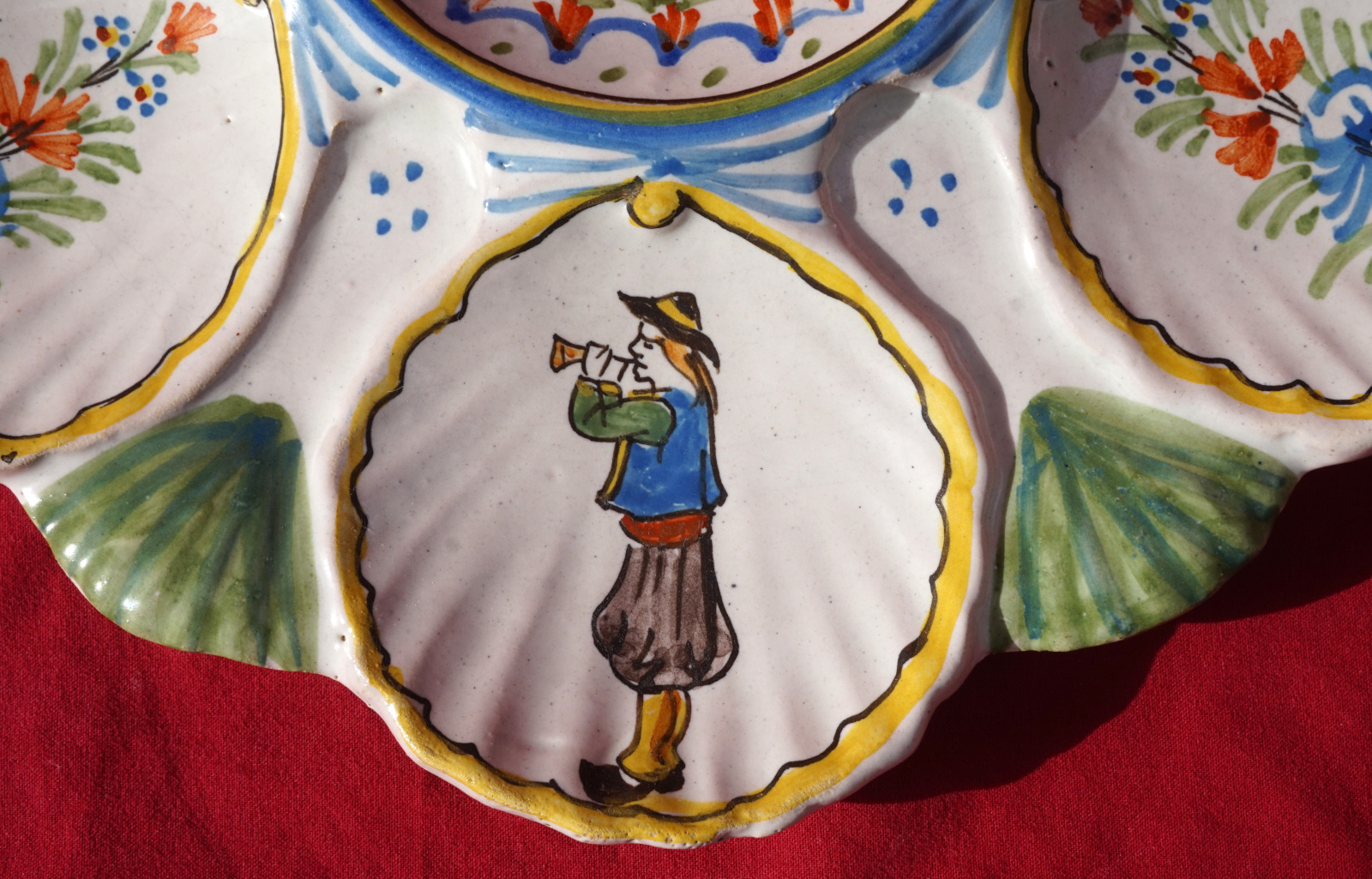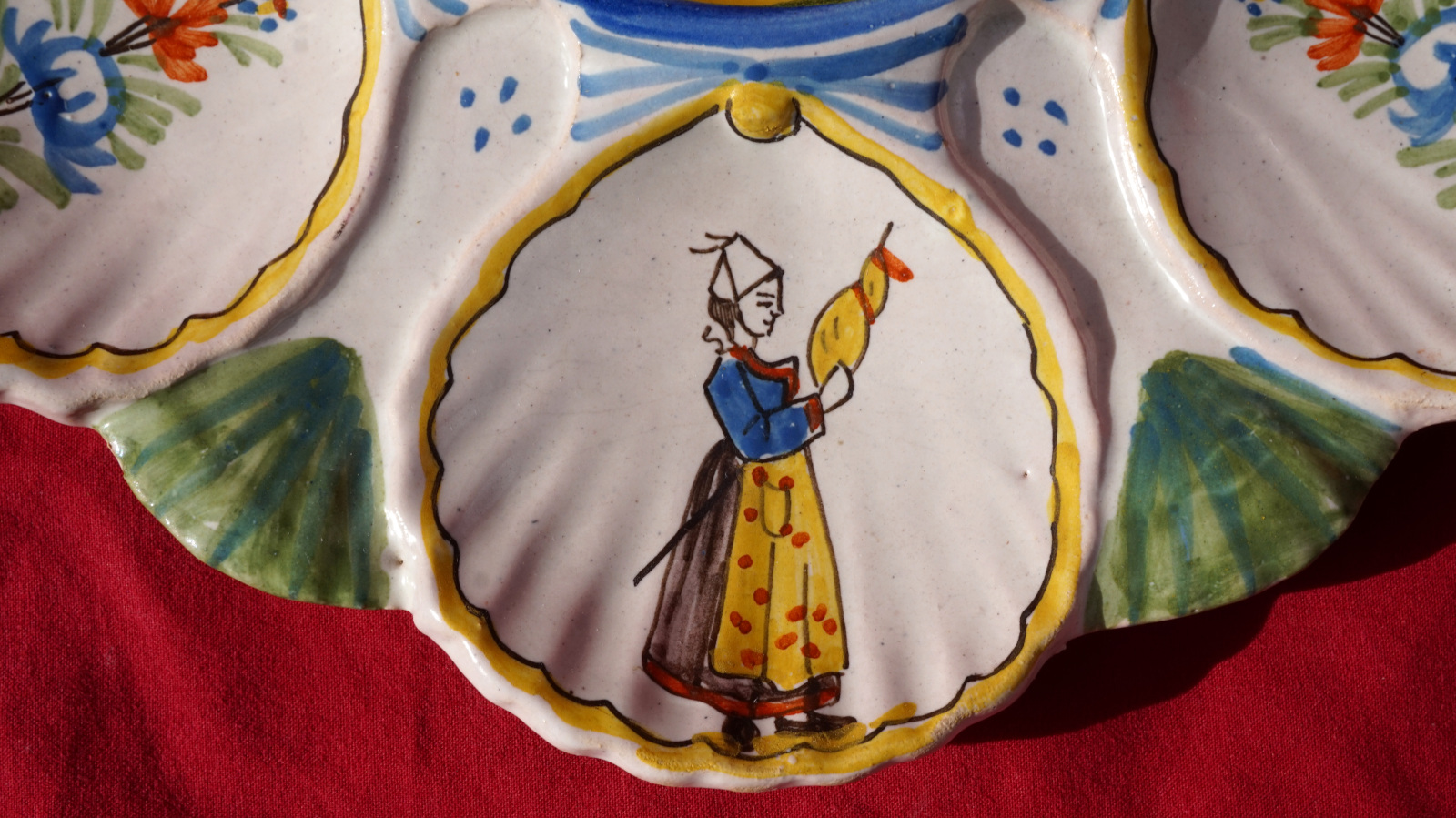 QUIMPER HR Oyster Plate Breton Bagpipe Player Distaff Faience 1900's E