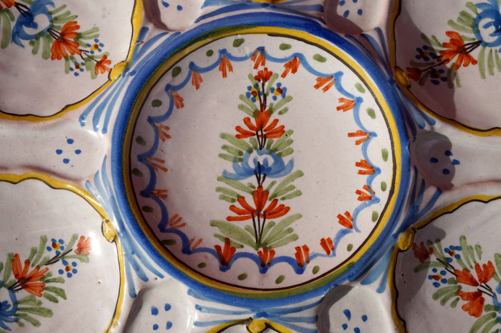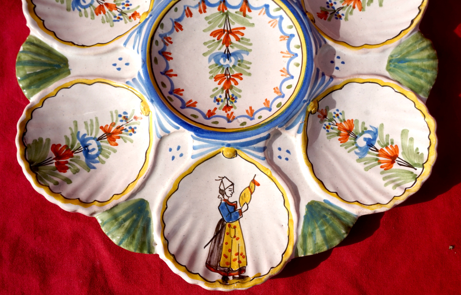 Assiette à huitres en faience peinte à la main, un breton et son biniou et une bretonne avec sa quenouille, manufacture HR Quimper vers 1900. Elle est signée sur son fond.Diamètre 23.2 cm. Parfait état.