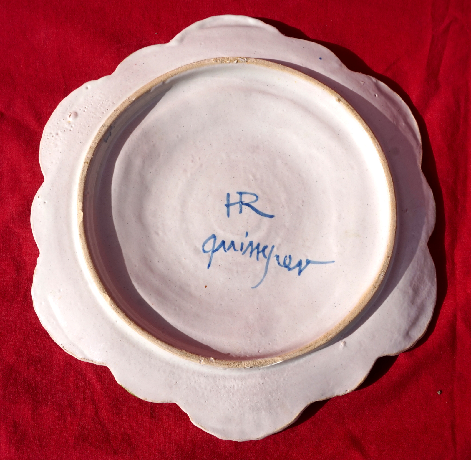 French hand painted faience scalloped oyster plate showing bretonne with her distaff and breton with his bagpipe made by HR in Quimper during the 1900's. 9 1/8" (23.2cm) diameter, weight 14.46oz (410 grams). Signed on the back. Perfect condition as shown by the following pictures.