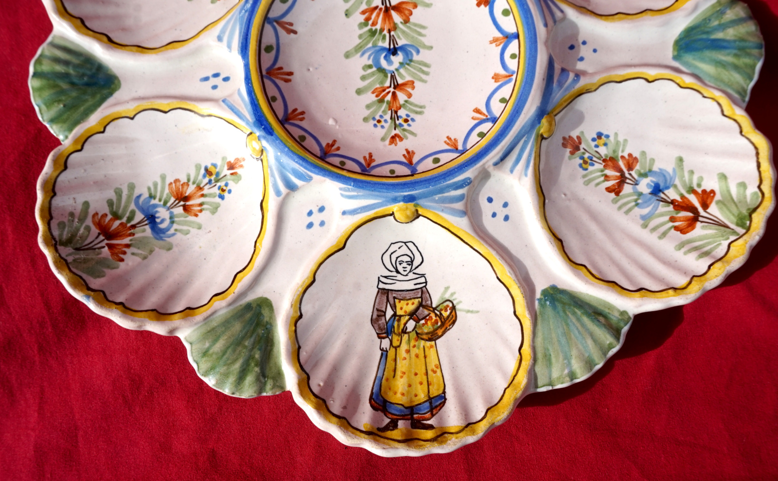 Assiette à huitres en faience peinte à la main, un breton et son fouet et une bretonne avec son panier, manufacture HR Quimper vers 1900. Elle est signée sur son fond. Diamètre 23.2 cm. Parfait état.