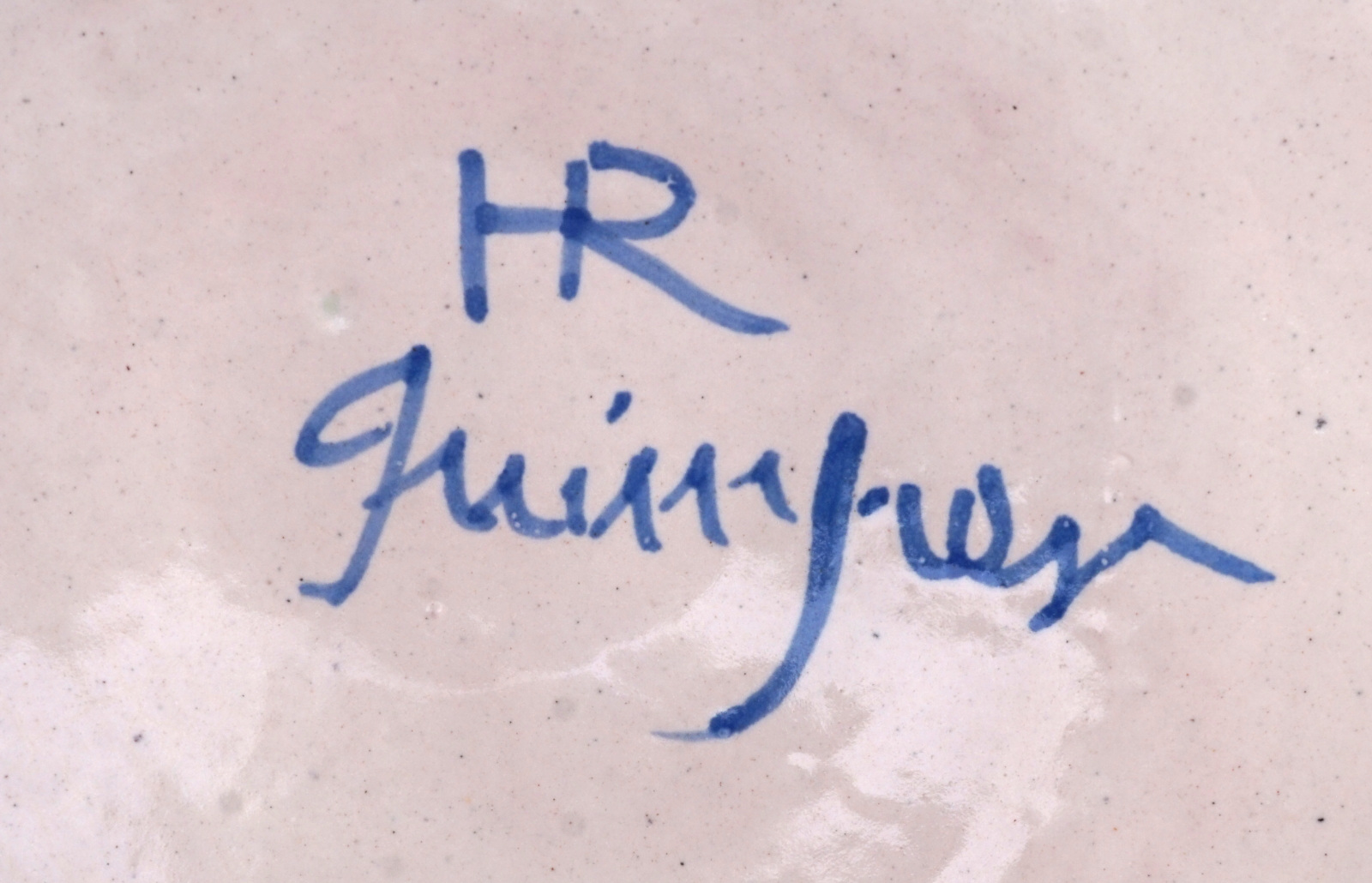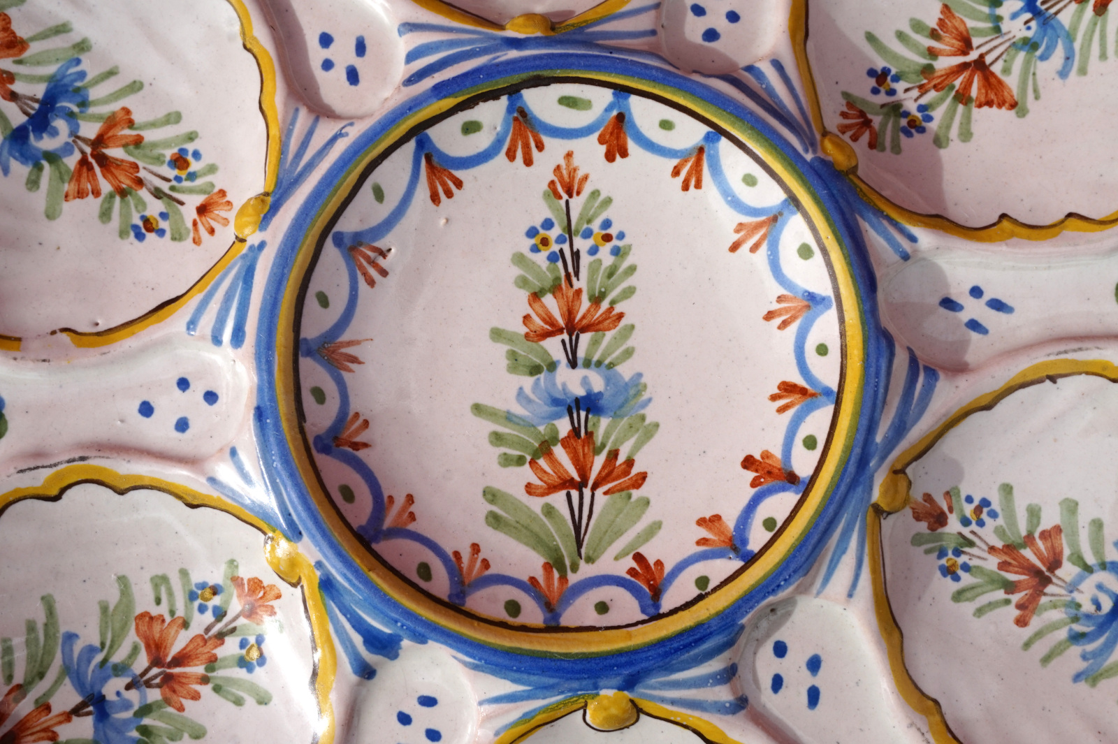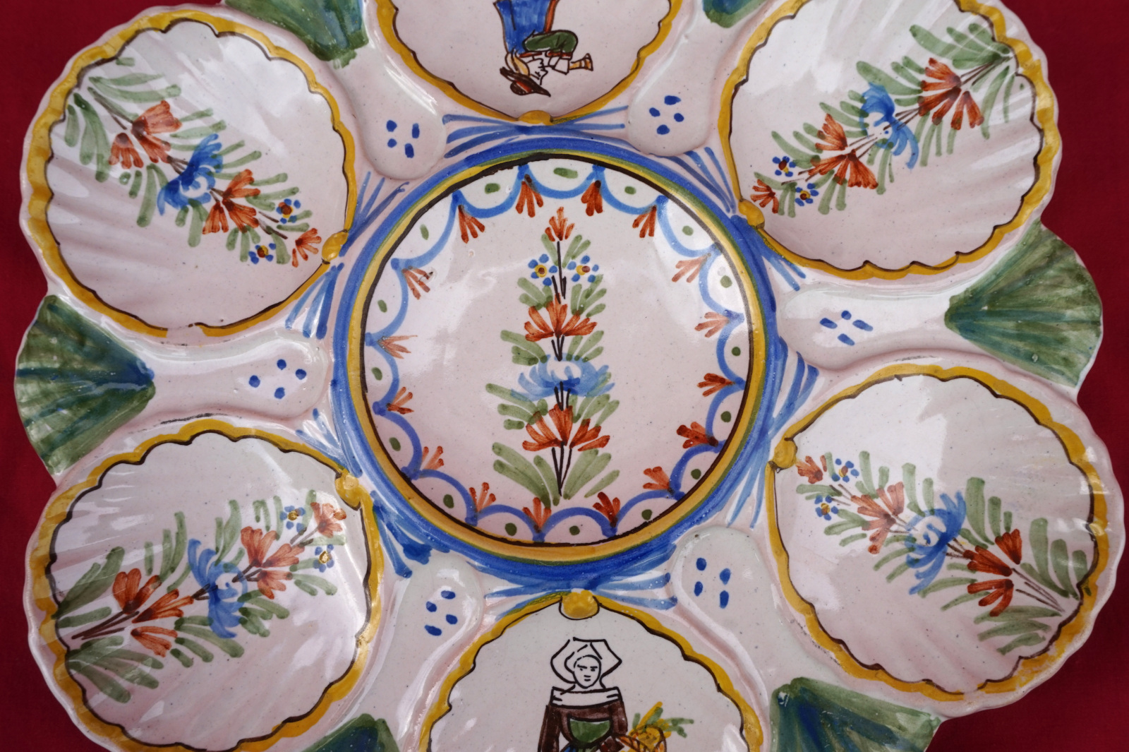 Assiette à huitres en faience peinte à la main, un breton et son biniou et une bretonne avec son panier, manufacture HR Quimper vers 1900. Elle est signée sur son fond. Diamètre 23.2 cm. Parfait état.