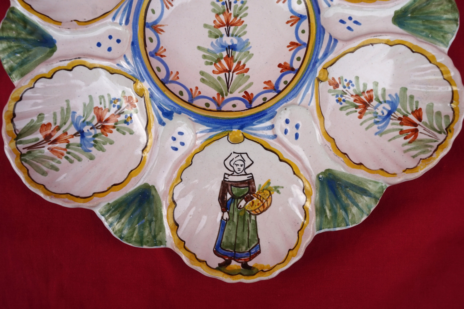 French hand painted faience scalloped oyster plate showing bretonne with her basket and breton with his bagpipe made by HR in Quimper during the 1900's. 9 1/8" (23.2cm) diameter, weight 14.46oz (410 grams). Signed on the back. Perfect condition as shown by the following pictures.