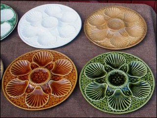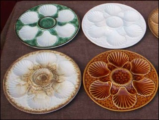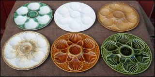 Ensemble de six assiettes pour le service des huîtres à six compartiments pour les coquillages et un central pour le citron, de la manufacture de Longchamp, vers 1930, toutes à décor différents. Elles sont en très bon état et signées sur leurs fonds. Diamètre 24 cm.
