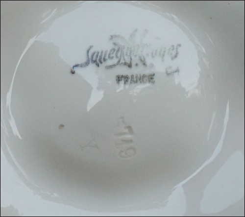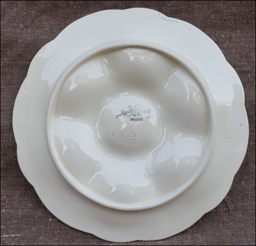French oyster plate 6 well shaped and one central for the lemmon showing a starfish on a fish net made by Sarreguemines during the 1940's. It's signed on the back Sarreguemines France with Y 5719 for the model. 9 1/2" (24cm) diameter. Perfect condition as presented on the following pictures.