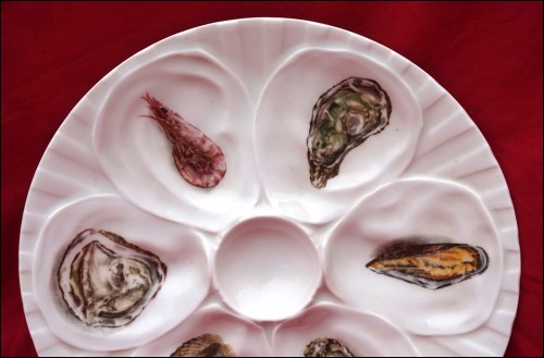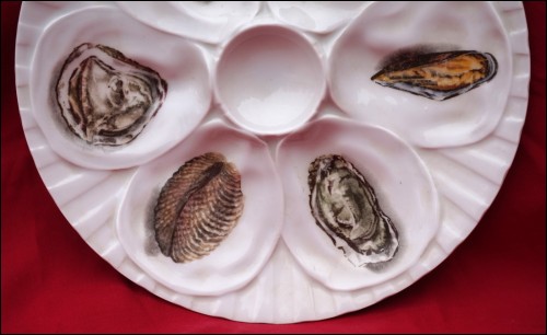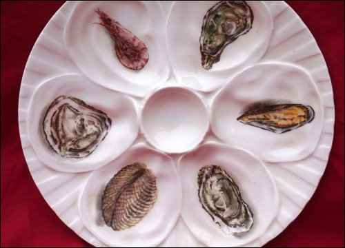 Assiette à huîtres à six compartiments pour les coquillages et un central pour le demi citron de la manufacture de Porcelaine "L'hirondelle" de Mehun sur Yevre, née vers 1970. Elle est pressé à la main: marque de sculpteur sur le fond. Elle est décorée de coquillages, dont les trois grandes variétés d'huîtres d'Europe: la belon, la creuse et la portugaise. Signée sur son fond, elle est en bon état. Diamètre 22.5 cm.