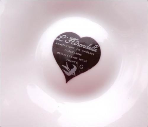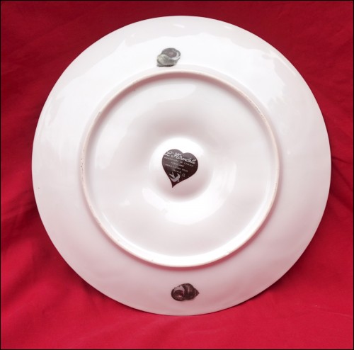 French transferware porcelain oyster plate shaped made by the famous l'Hirondelle in Mehun sur Yevres near Limoges during the 1970's 1970. It's signed on the back with sculptor mark stamped. 8 7/8" (22.5cm) diameter. Perfect condition as shown by the following pictures.