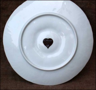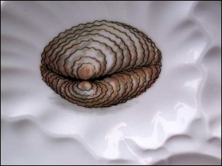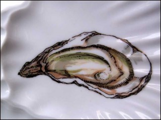 Assiette à huîtres à six compartiments pour les coquillages et un central pour le demi citron de la manufacture de Porcelaine "L'hirondelle" de Mehun sur Yevre, née vers 1970. Elle est pressé à la main: marque de sculpteur sur le fond. Elle est décorée de coquillages, dont les trois grandes variétés d'huîtres d'Europe: la belon, la creuse et la portugaise. Signée sur son fond, elle est en bon état. Diamètre 22.5 cm.