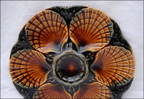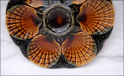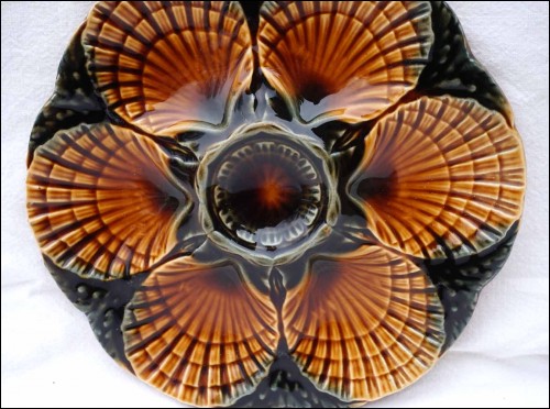 French faience 6 compartments for shells and one central shaped oyster plate made by Sarreguemines during the 1970's. 9 1/4" (23.5cm) diameter. It's signed on the back. Perfect condition as shown by the following pictures.