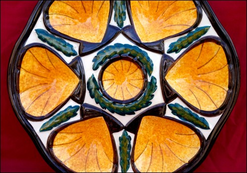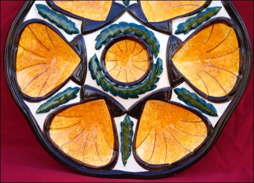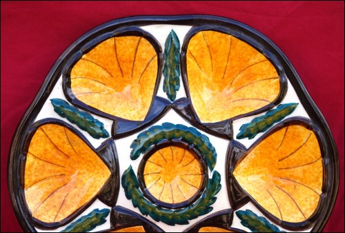 French oyster plate in hand painted faience made by St Jean de Bretagne near Quimper during the 1960's. It's shapped with 6 shell compartments and one for the lemon or the butter. It has great colors of enamel on a cream background.10"5/8 diameter. It's signed on the back. Perfect condition with a hole for hanging on the back as shown by the following pictures.