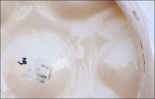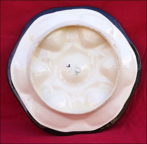 Assiette à huître à six compartiments pour les coquillages et un central pour le citron, de la manufacture de Saint Jean de Bretagne, près de Quimper, vers 1960. Signée au dos avec un trou pour l'accrochage. Elle est en bon état. Diamètre 27 cm.