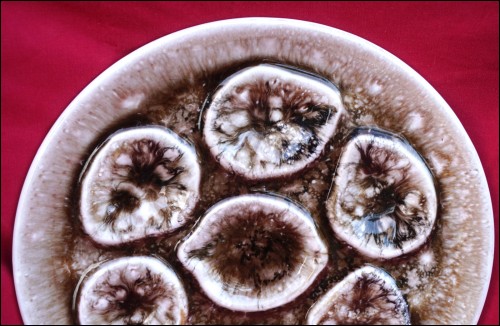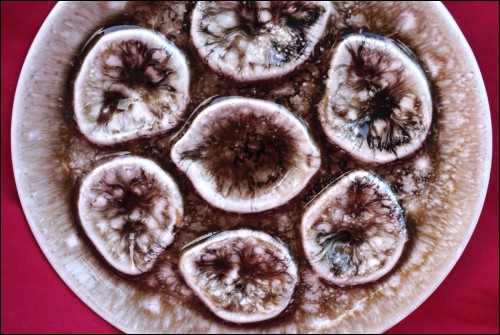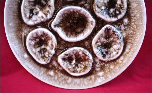 Assiette à huître à six compartiments pour les coquillages et un central pour le citron, vers 1950. La majolique est à décor d'écume de mer blanche sur fond chocolat. Elle est en très bon état. Diamètre 25.4 cm.